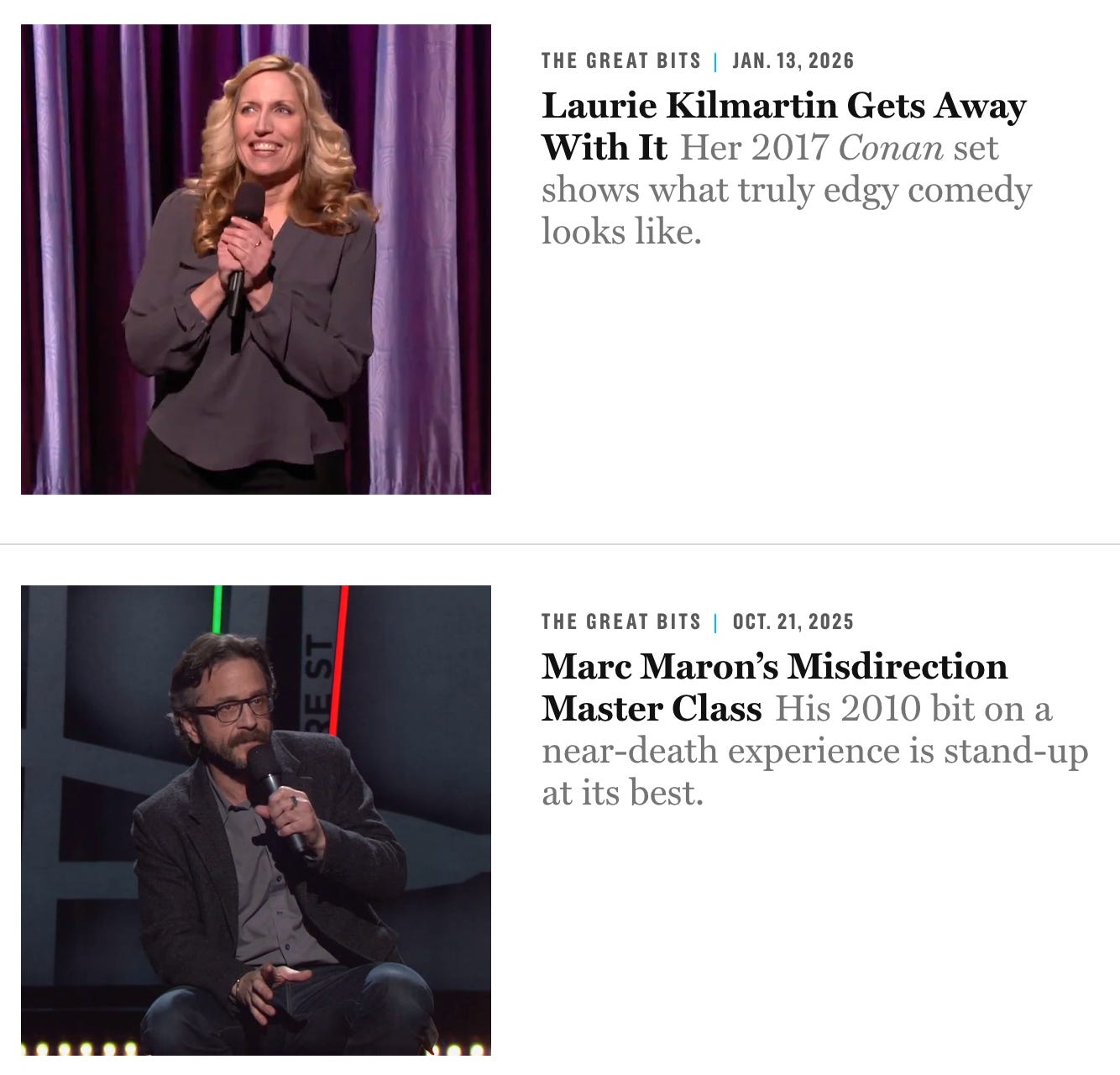 More of his writing about comedy at Vulture. And his online comedy class is a great resource for newbies. And if you’re in Chicago, he’s doing a live workshop on Feb. 22 where attendees learn from great bits.