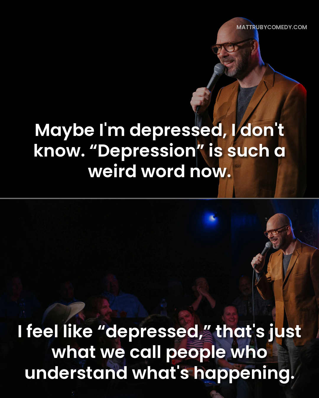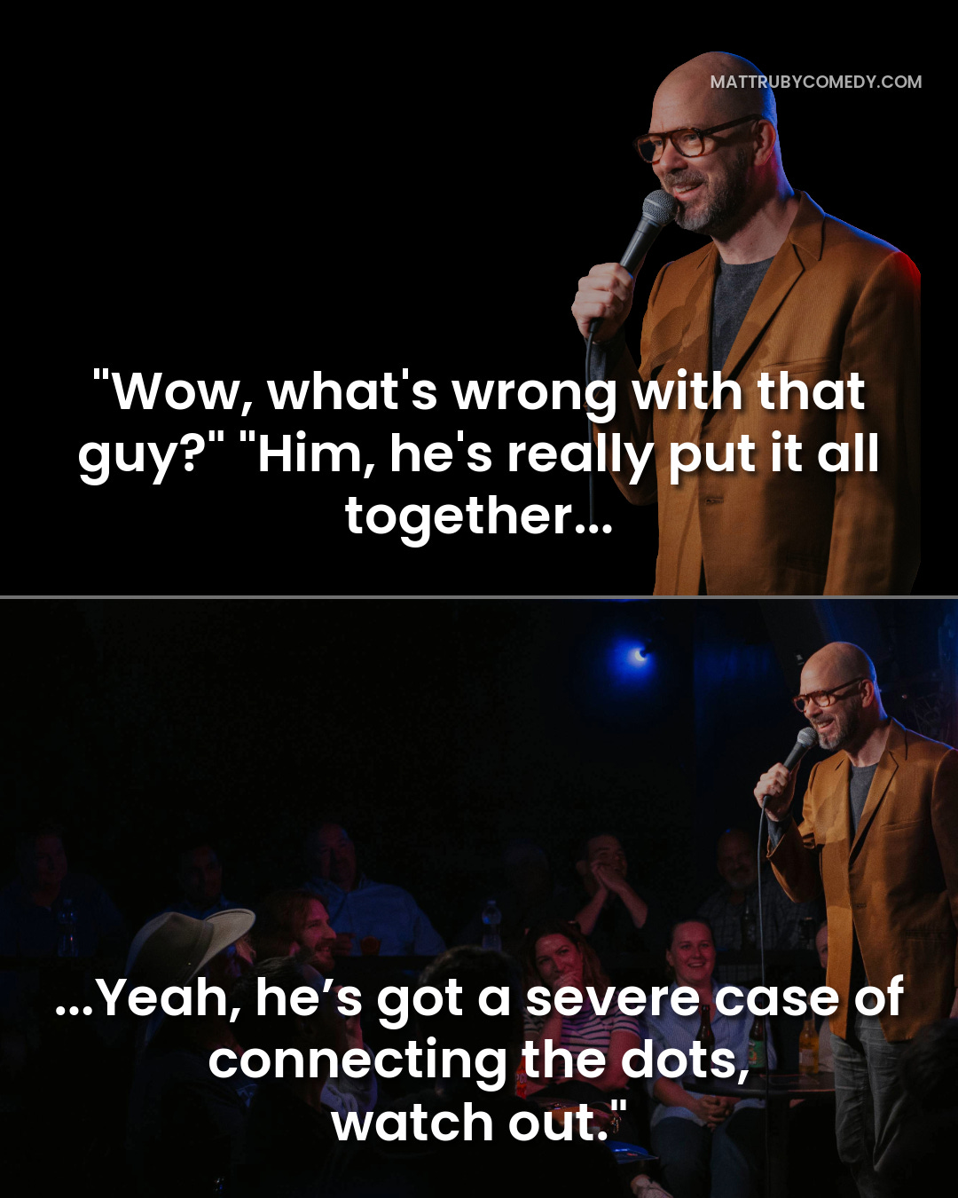 Robert Mac (16:47–16:58): I would say to your first point, if you can get a laugh, a joke is a setup and then a punchline. If the setup is something that you don’t have to say...If you walk out on stage, and the guy’s seven feet tall, he has a joke about being seven feet tall. He doesn’t have to say, “Hey, everybody in the audience who’s looking at me, I’m taller than...” He can automatically do the punchline because the setup is visual and unspoken, and the audience knows it before he’s even taken the mic.